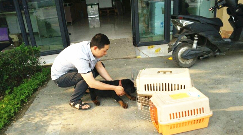 我司工作人員正在小心翼翼的將客戶的愛犬裝入航空籠。