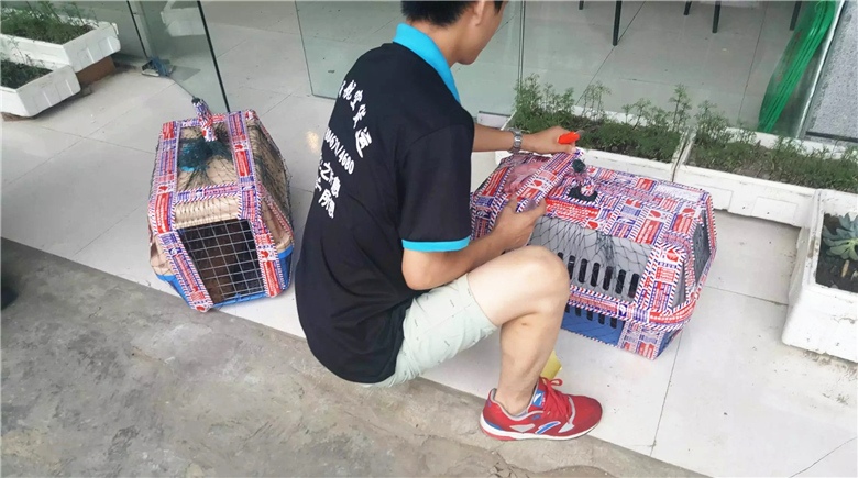 我司同事正在給客戶發到南寧和沈陽的愛犬進行包裝加護。